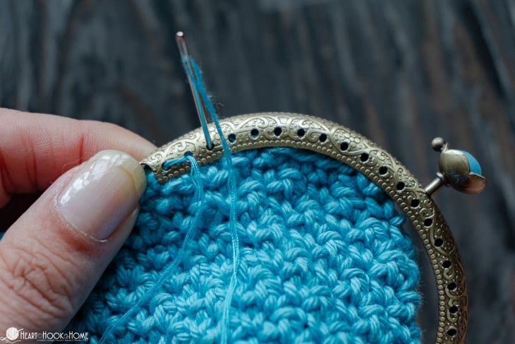 7. Periodically check that the stitch marker will line up with the other hinge of the clasp. Sew through the innermost clasp holes twice for added durability.