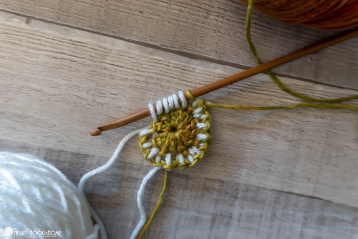 To start, make a magic circle using Color B. Chain one and make 12 double crochets in the circle. Pull tight. Join to the top of the first stitch made using Color A.