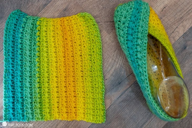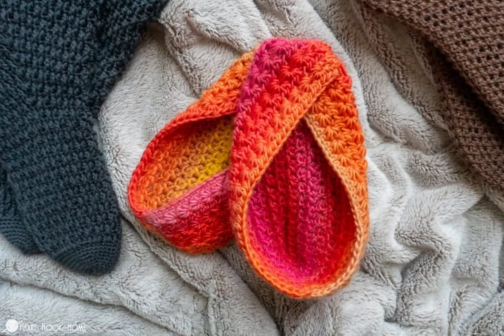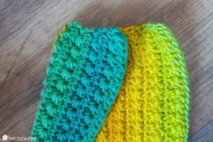 This month’s pattern is a rectangle style folded crochet slipper that is so easy to make. I love the thickness of this stitch, and the way this yarn’s colors transition is perfection. That being said, you can make any rectangle using any stitch (including single crochet, half double, or any sturdy stitch such as the Thermal or Alternating Single Crochet Spike Stitch). You’ll fold the rectangle in the same way no matter which stitch you use.