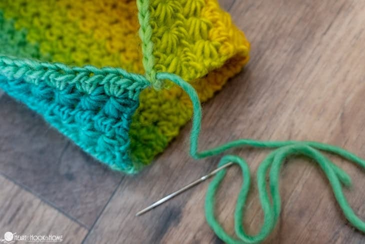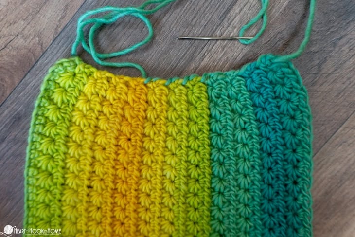 Fasten off leaving a ~12โ long tail for seaming. Fold rectangle in half widthwise and sew row end for row end. Weave in end.