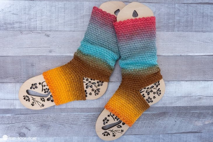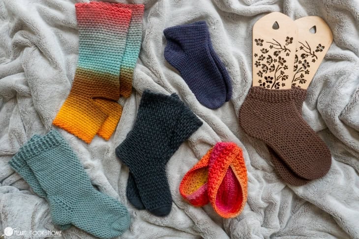 You could instead make a slipper sock, a thicker, warmer sock, using Brava Recycle, also pictured below. More details on the bonus pattern are included in the complete Sock Week Collection PDF on Etsy and the Heart Hook Home Blog Shop. Make sure you’re signed up via email so you’re notified when that goes live!