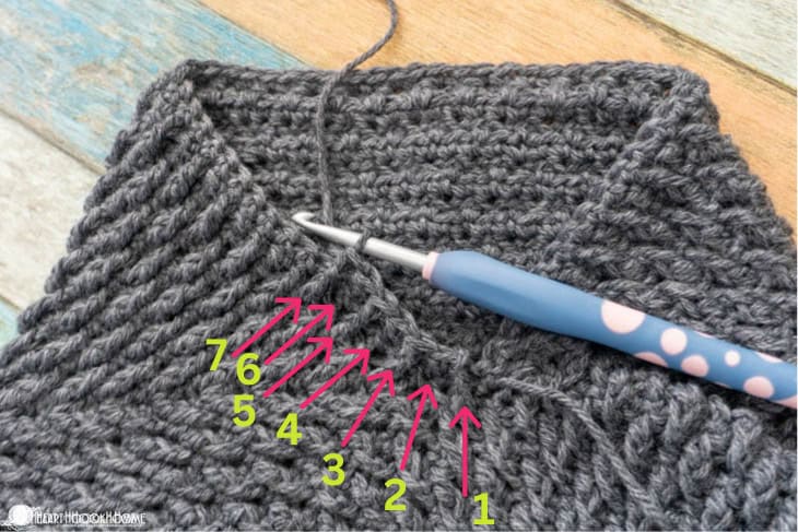 Row 1: Ch-11, hdcslst in 2nd ch from hook and in each chain. Sl st to corresponding st on sleeve. (10)