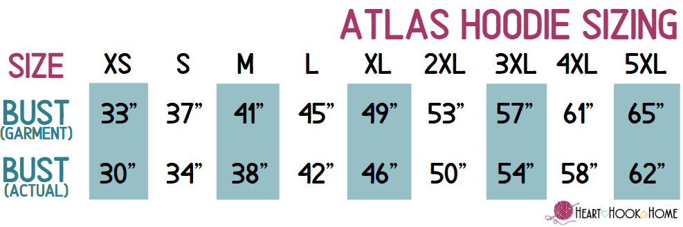 This hoodie pattern ranges in size from XS to 5XL. This pattern also has INTERCHANGABLE sleeves with the Matterhorn Sweater! If you don’t like the bulkier sleeves used in this version of the Atlas Hoodie, simple swap them out for the same pattern size of the sweater pattern.