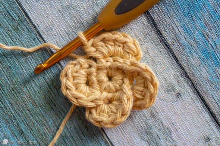 Round 2: Do NOT turn. * Working behind the petal from round 1, sc in the center sc of the base of the first petal. Ch-3, turn, sl st around the post of the previous petal. Ch-1, turn back around, 7dc around ch-sp just made. * repeat between * * 3 more times. (4 dc petals)