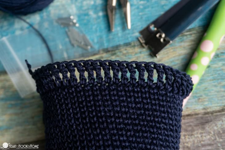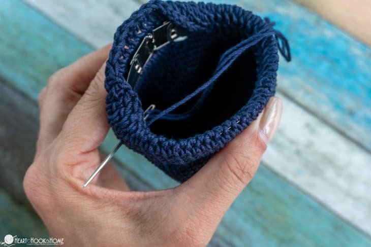 Optional Drawstring: If you donโt want to use the metal clasp you could instead make a drawstring using your preferred method (Lucet Fork, iCord, Romanian Cord, etc) that is approximately 12โ long. Feed it through the small spaces between the stitches around the bag. Tie like a shoelace.
