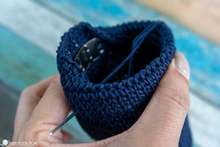 Using a yarn needle, seam around the metal clasp, encompassing it all the way around. It helps to make sure that you have the halfway mark on track. (24 sts for one half of the clasp and 24 sts for the other half.