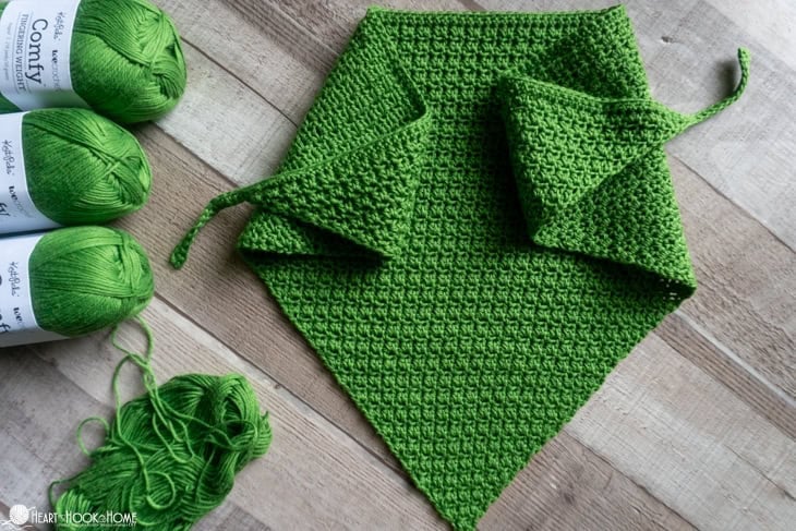 This triangle shaped dog bandana is easy to work up. We start crocheting from the bottom point of the triangle, building onto both sides as we work our way up. This construction allows us to stop when we get the bandana to the desired size.