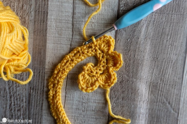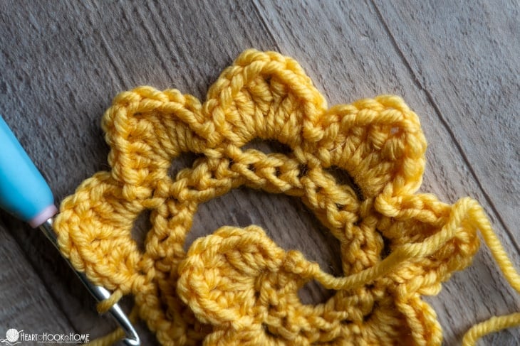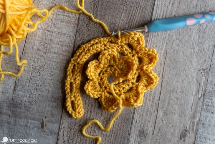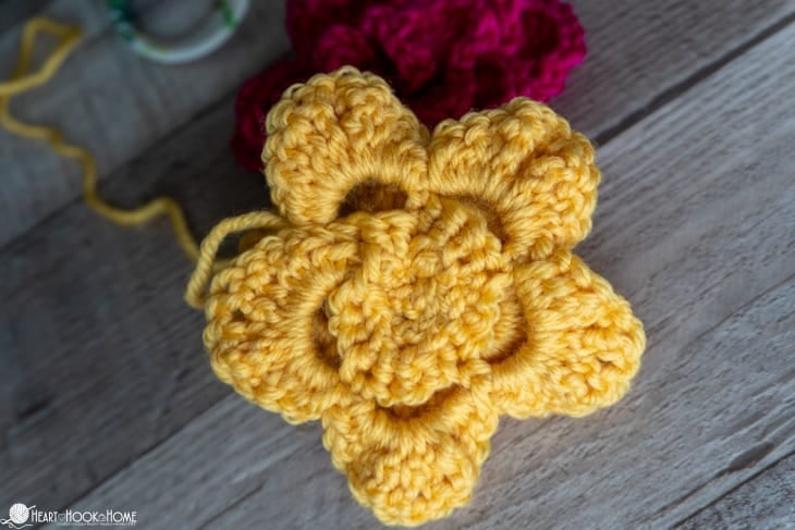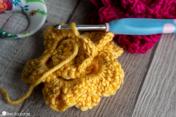 Fasten off and attach to a sturdy portion of the opposite side of the flower to form a loop into which the collar will be inserted. Weave in all ends very securely.
