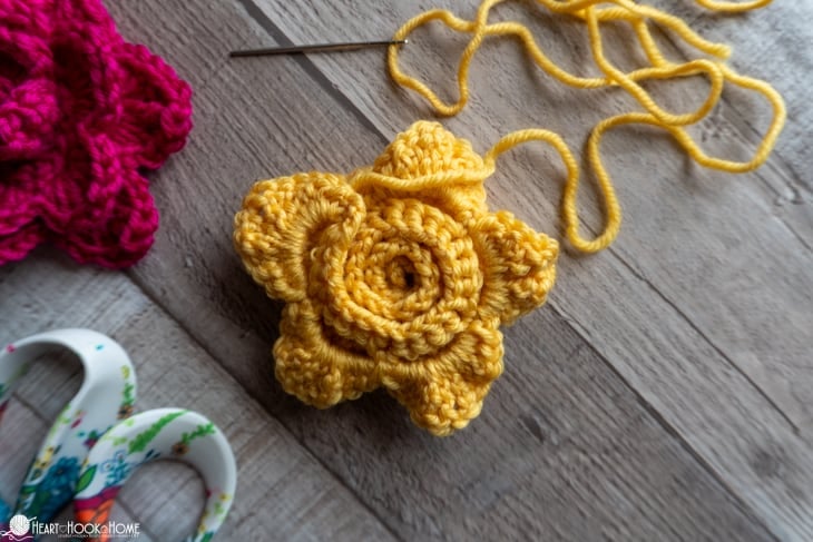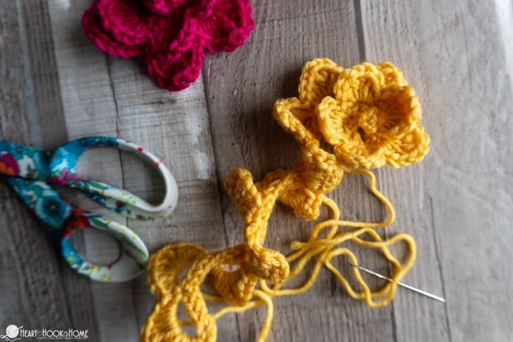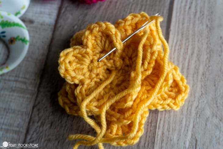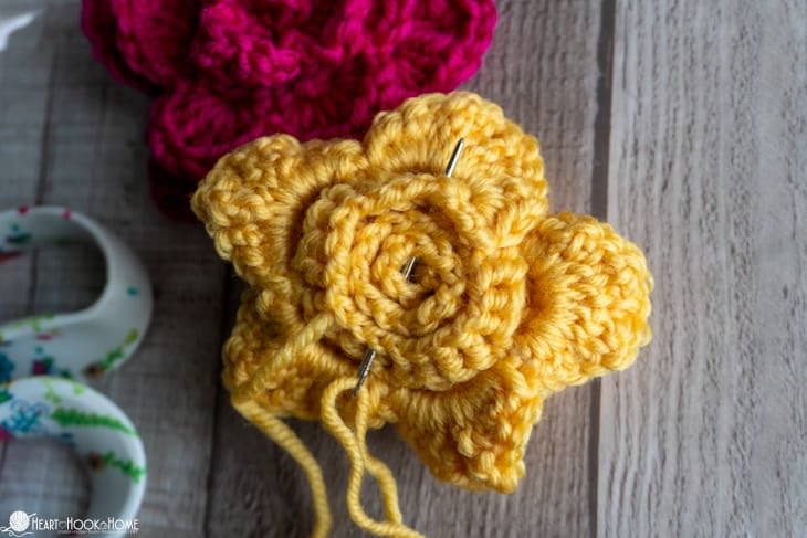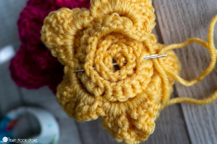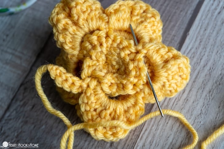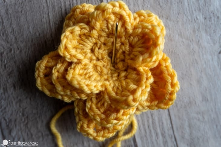 Use the yarn tail to secure the flower going straight through all layers in several directions.