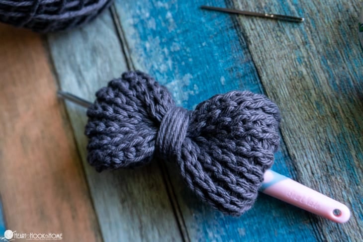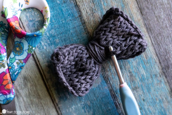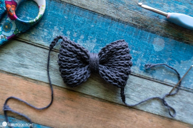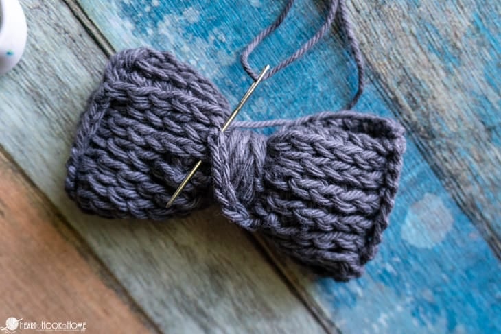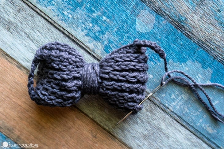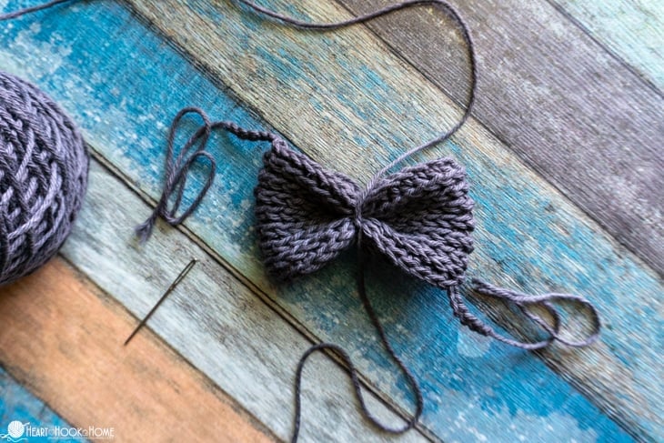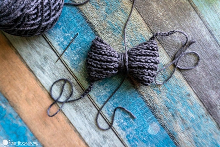 Press the bow tie flat with one yarn tail on either side. Using the remaining yarn, cinch the center of the bow tie as tightly as possible.