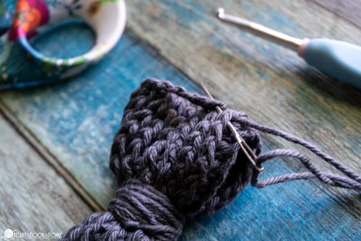 With what yarn remains, use the crochet hook to create a Fsc-5 (or a ch-5 but it is less secure).