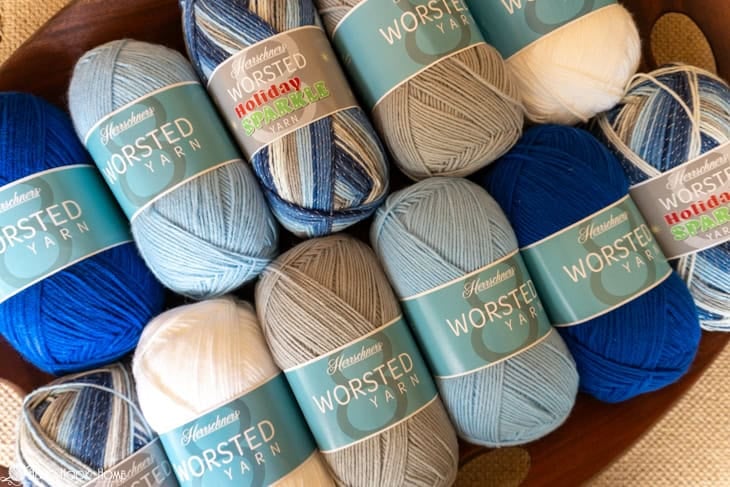 For this Holiday Stitch Mix throw I ordered a total of ELEVEN Herrschners Worsted 8 acrylic yarn skeins. Each skein has 489 yards meaning that if you order the same quantity of yarn as I did, we’ll each have 5,379 yards of Holiday fiber goodness to crochet up a stitch mix blanket to cuddle up underneath while opening presents this holiday.