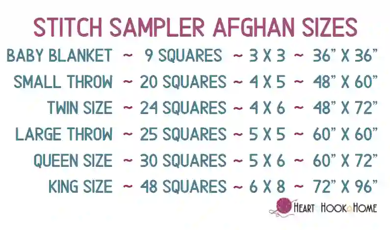 If you want to change the sized of your blanket or order more yarn, the squares needed for each of the sizes are listed below. Crochet as many of these squares as you like! The 12″ squares range in yardage from as little as ~120 yards to as many as ~180 yards a piece. They average 150 yards per square, and you’ll want anywhere from 500 – 1000 yards for the border, depending on how large the blanket.