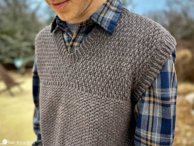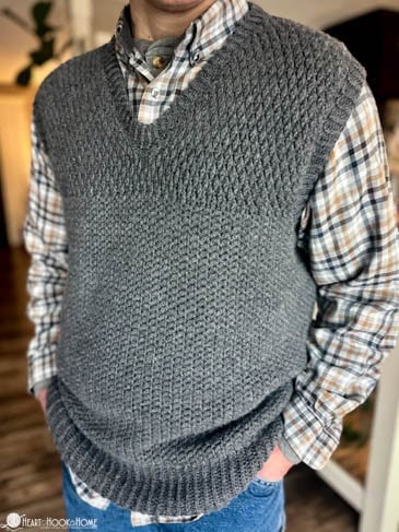 The Ararat Sweater Vest is a gorgeously textured crochet garment. Sizes range from S – 5XL. This vest pairs perfectly over a coordinating dress shirt. We are using a size 2 yarn, Heatherly Sport, to create it. I know you’ll love it!