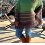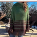 The poncho pictured in green and brown is a sport weight/size 2 yarn called Upcycle Alpaca Sport, a yarn that has sadly been discontinued. For the entire Alpine Collection I am recommending a sport weight/size 2 yarn and I used Heatherly Sport to make the sweater, sweater vest, cardigan, and hoodie. You could substitute Brava Sport, or check out this list of size 2/Sport weight yarns available online.