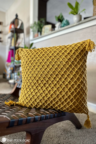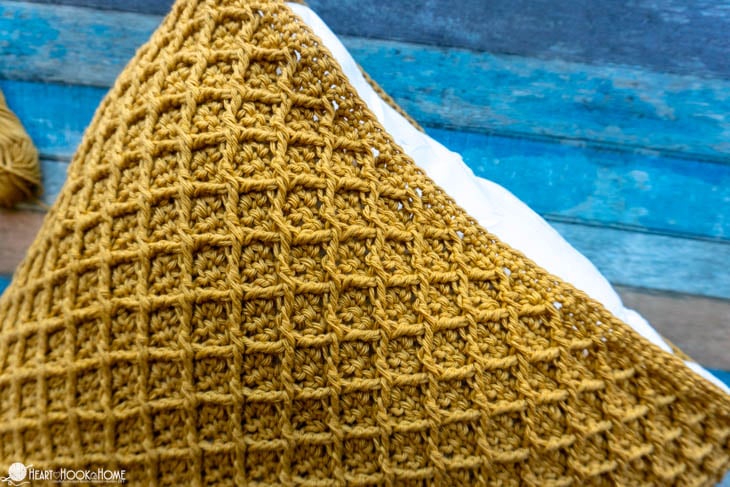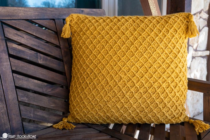 The Diamond Pillow Cover is an excellent way to spruce up an old throw pillow for something fresh and new. This pillow cover measures 20″ x 20″ and is made using worsted weight cotton yarn with an H/5m hook and features the Diamond Stitch. This is a fun, fabulously textured crochet pillow cover pattern.
