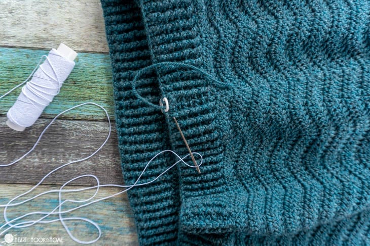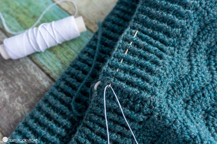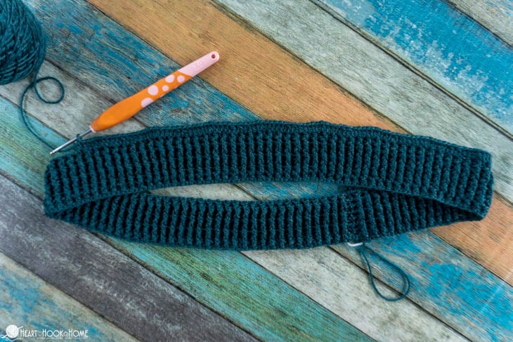 Use a yarn needle to weave the elastic thread along the inside of the band, under only the raised (would be the fp) post stitches. Work in a spiral for several rounds of the band until you feel satisfied with the amount of elastic support. Secure the ends and youโre finished!