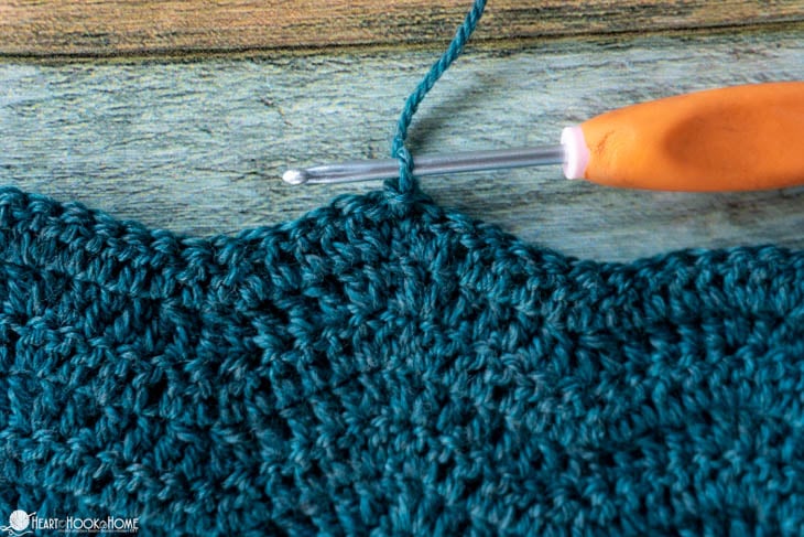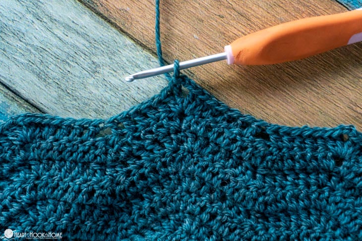 Round (31, 33, 33, 35, 35, 37): Turn, sl st between sts (between the first and last st of the previous round), ch-3 (counts as dc here and for remainder of pattern), dc in same space, dc in next 5 sts, sk-2 sts, dc in next 5 sts, * (2dc, ch-2, 2dc) in between next 2 sts, dc in next 5 sts, sk-2 sts, dc in next 5 sts * repeat between * * around, (2dc, ch-1) in same sp as beg sts. Join to 3rd ch from beg chain. (9, 10, 11, 12, 13, 14 Chevrons)