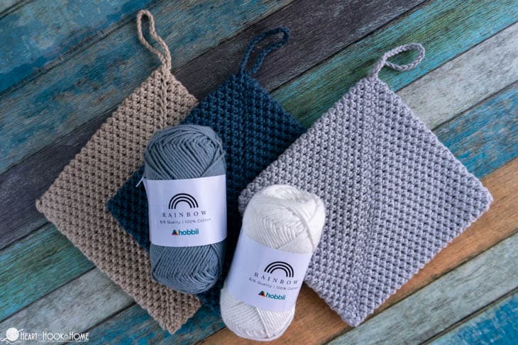 Note that if you substitute worsted weight cotton instead that’s fine! The hot pad will come out a big larger, but that’s fine too.