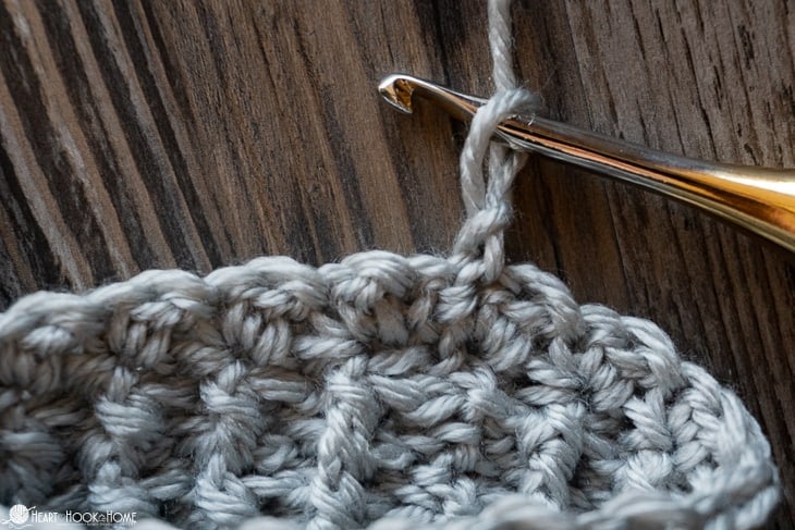 Row 1: Fhdc– (33, 43, 53) (or ch- (34, 44, 54), hdc in 2nd chain from hook and in each to end.) Join to top of first st with sl st. Stitch count: (33, 43, 53)