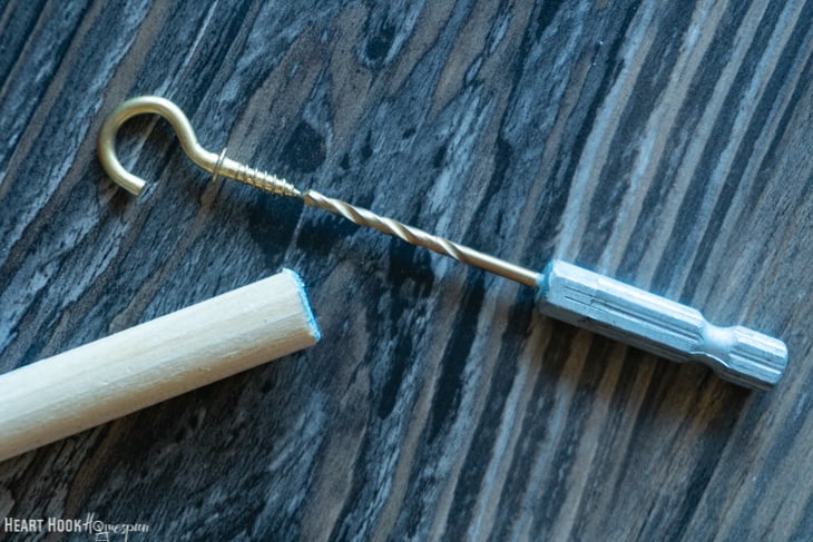 The shaft (stick) needs to be about 10″ long. It can be as short as 6″ for a mini spindle, or as long as 12″. A dowel rod from the craft store would be perfect (and I just so happened to find one in my garage from some other projects presumably years ago), but so would a fresh pencil found at the bottom of your junk drawer.