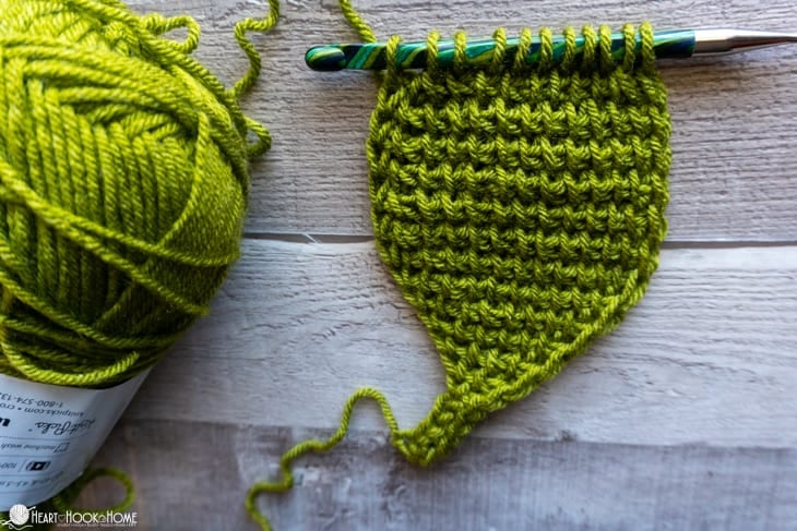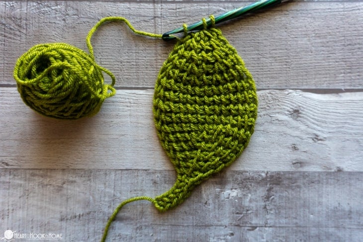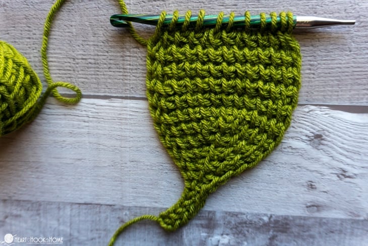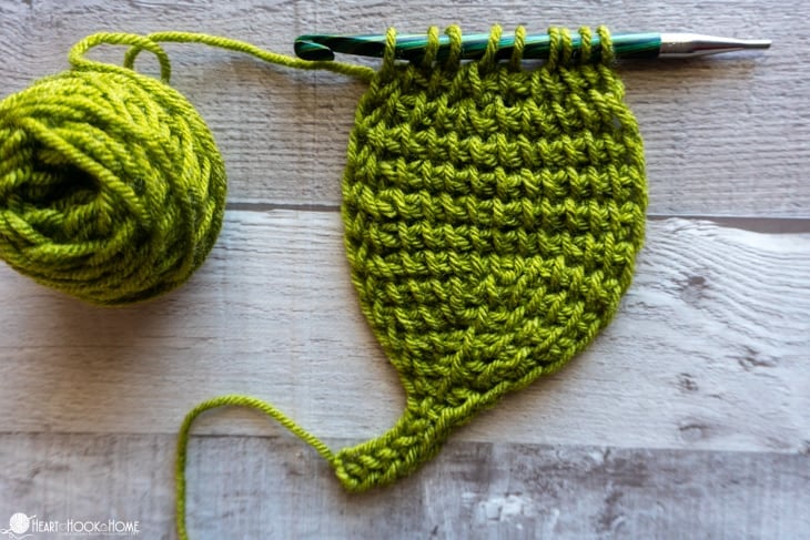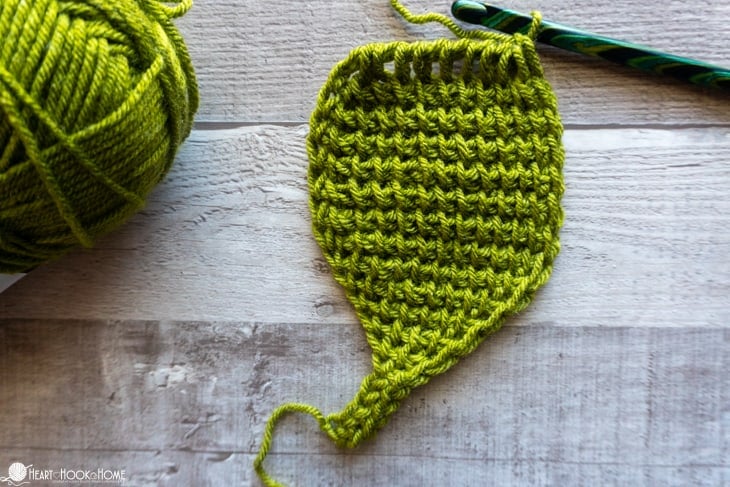 To demonstrate and practice decreasing we are working up a few of these cute little Tunisian crochet leaves. Last week we did the first half of the leaf where we increased to grow the width, then we did several rows of solid Tunisian Simple Stitch. Now we are ready to do some decreasing that will shape the top part of the leaf.