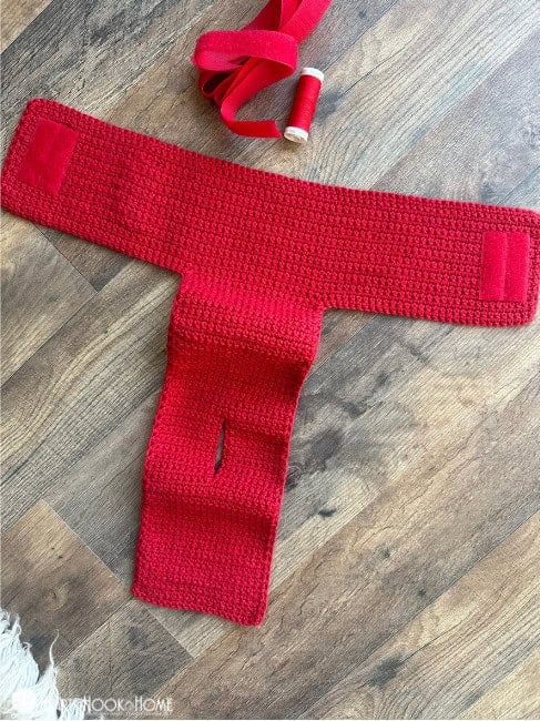 - Place your Velcro on the top side of the diaper portion and attach the opposite side of the Velcro to each side of the waist band. If you’re overlapping the band (IMO it works better for more active dogs to overlap them) make sure you’re adding Velcro to all appropriate areas (4 patches total).