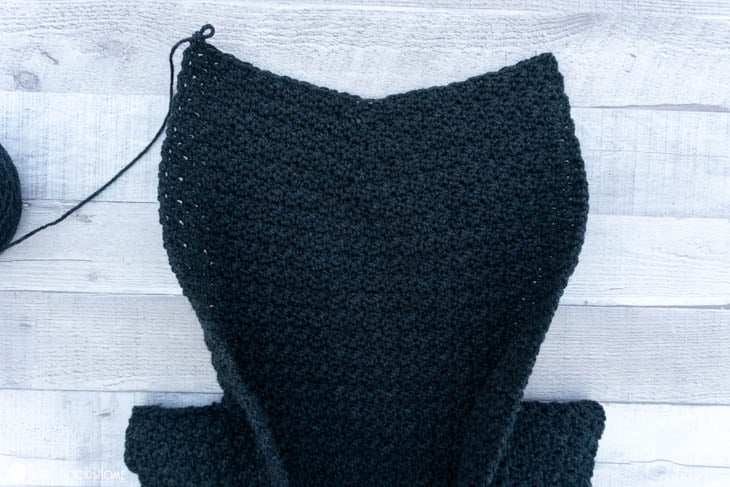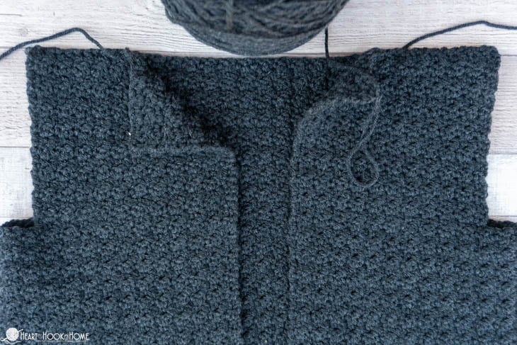 Do not fasten off. Mark with st marker as we will pick back up using this yarn to make the hood after construction.
