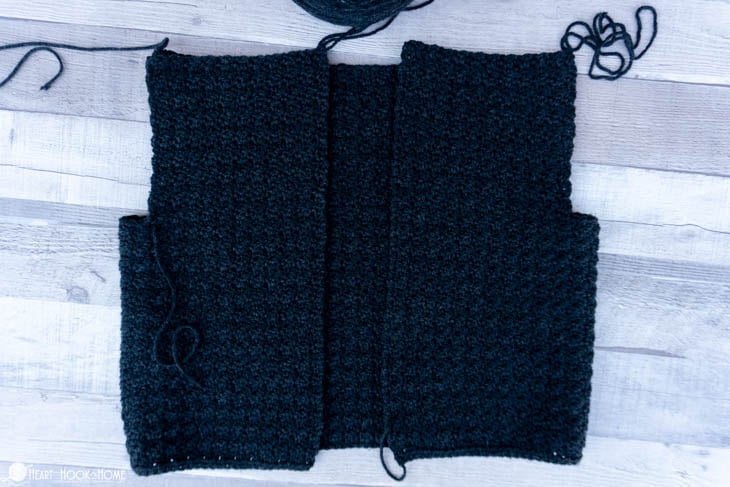 Rows 4 through (90, 100, 110, 120, 130, 140, 150, 160, 170): Alternate previous two rows around the entire bottom of the vest. Do not fasten off. Your hook should be at the outermost corner of the bottom right (if you were wearing the vest)