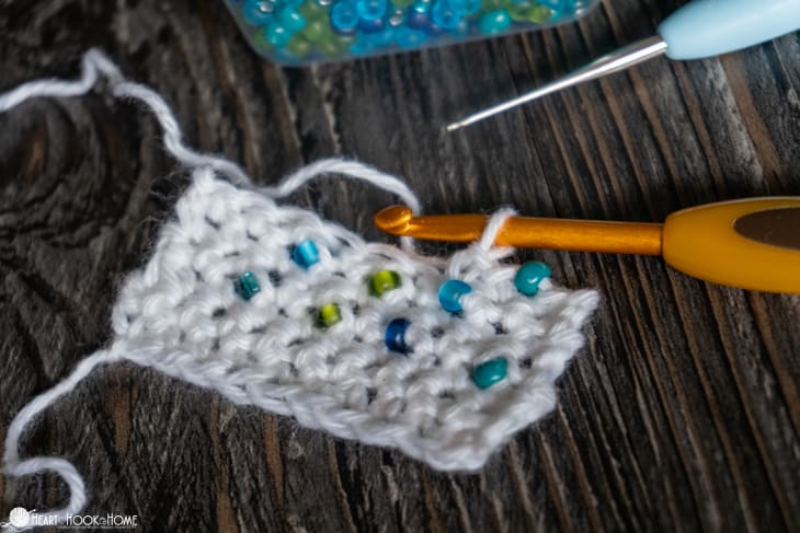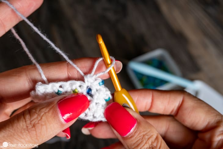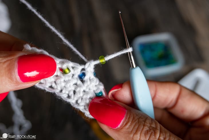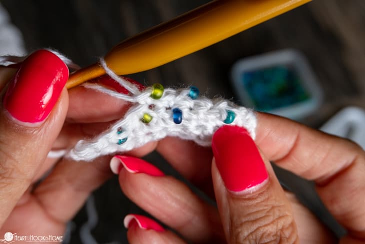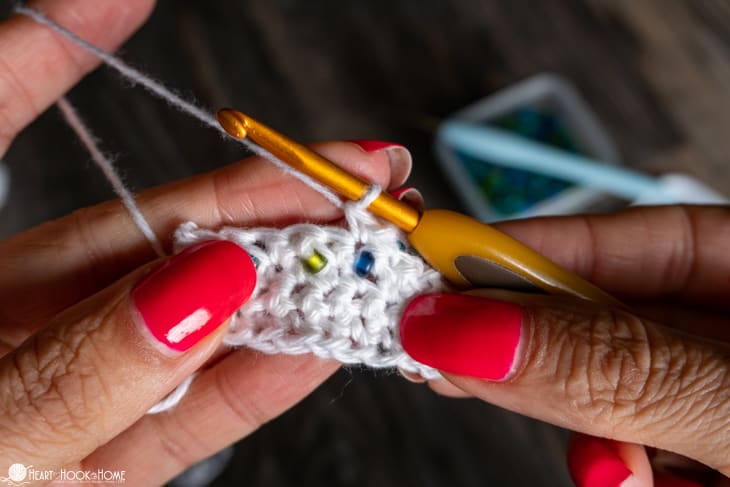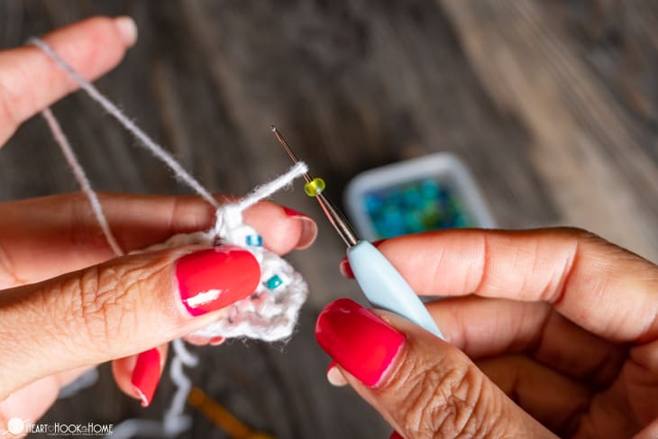 To do this, pull the loop a bit taller than normal. Put a bead on your tiny hook, grab the yarn and pull it through the bead. Then re-insert the regular crochet hook to complete the stitch.