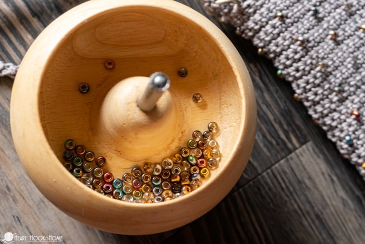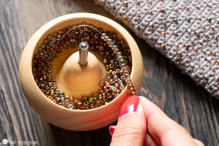 For this you will take the yarn, or crochet thread, and string as many beads as needed for your project. You can either add them in the color sequence needed (which will require plenty of planning) or you can add them randomly and let the bead colors fall where they may. I prefer to find a bead mix that I love and just string the beads on randomly. You can string the beads by hand (which can be tedious) or with a bead loader tool like this one. (I demonstrate this in the video below)