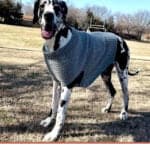 Rogi is a 1-year-old Great Dane, so still a bit on the “thin” side. The sweater fits him perfectly with a bit of room for him to fill out as he matures. Isn’t he a handsome boy?!