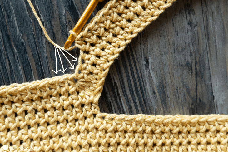 Rounds 39 & 40: Hdc in each st around, placing a hdc4tog at each corner where the strap meets the bag.