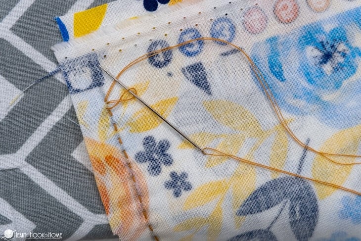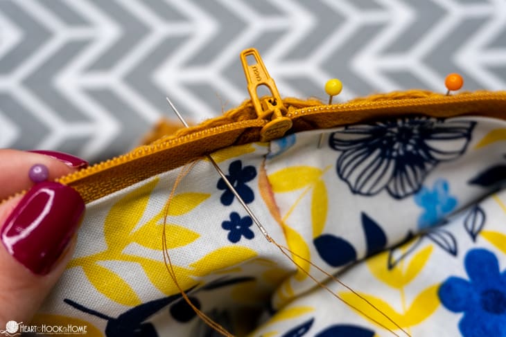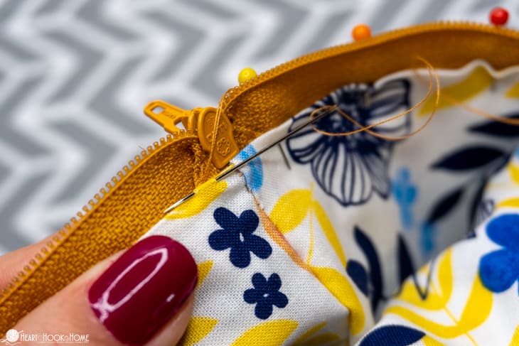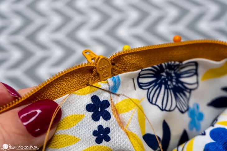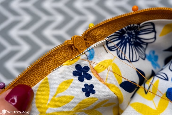 The way I hide my stitches so well is to go through the crocheted portion and the zipper only, then insert my needle into the fold of the fabric lining for about 1/4″ along that edge. Like this: