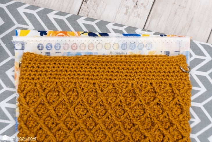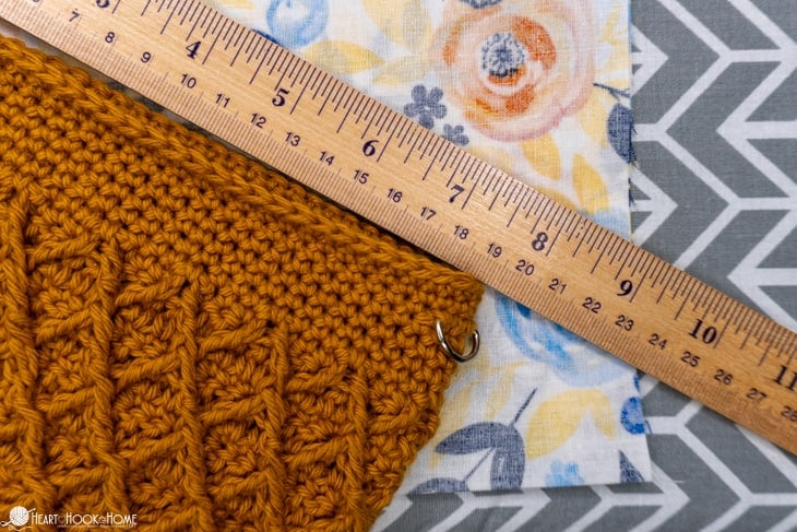 To start the other side, measure how wide the lining needs to be. Make sure you are measuring the INSIDE opening of the bag, not the total width including the actual crochet. The lining should nest down inside of the bag, and not be too bulky.