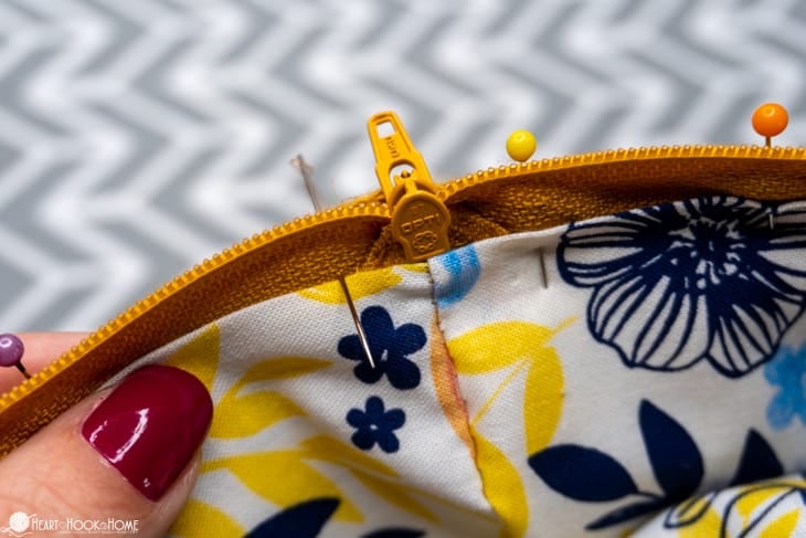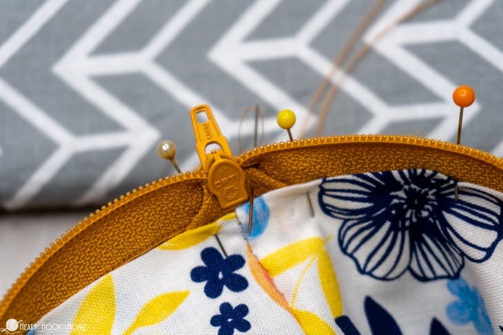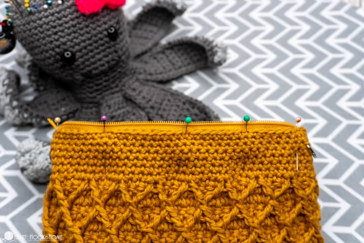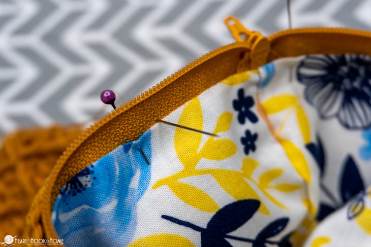 I like to start with the stopper end of the zipper – with the zipper fully open- inserting it between the crochet and the fabric lining, making sure everything is centered and lined up nicely. From here we’ll align and pin each side so that the zipper meets in the correct spot on the opposite side.