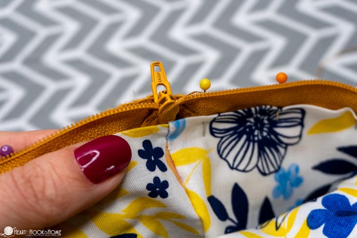 While pinning you’ll want to make sure that the distance between the zipper teeth and the fold of the fabric remains consistent. You will need to tuck in the portion of the zipper near the stopper to form a 90ยฐ angle (see the diagonal lines in the photo below and how its folded). Make sure you pin through ALL layers of fabric and zipper here!