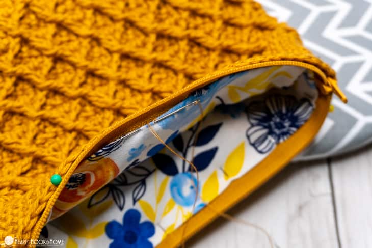 Complete all the way around, removing the pins as you go and making sure that the distance between the zipper and the crochet AND the fabric lining remains consistent throughout.