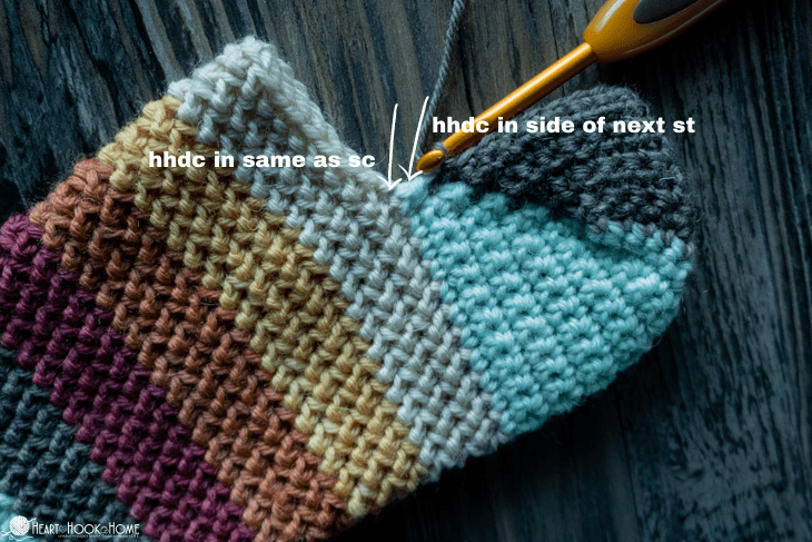 Hhdc until you get back to the side of the sock, directly above the first stitch from round 13.