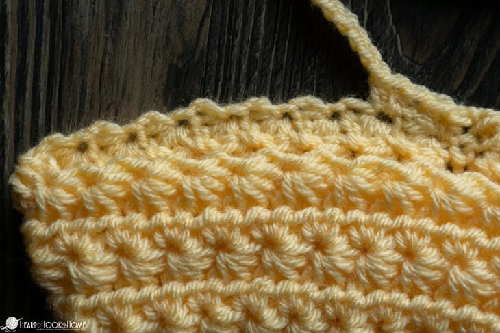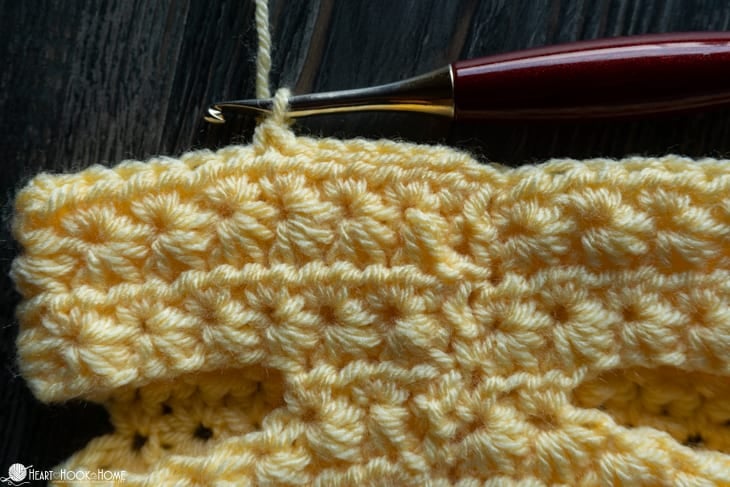 Round (-, -, 42): Ch-3, turn, Star st (-, -, 21) times across, sc in same as last. (-, -, 21 star sts + sc)