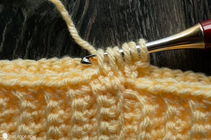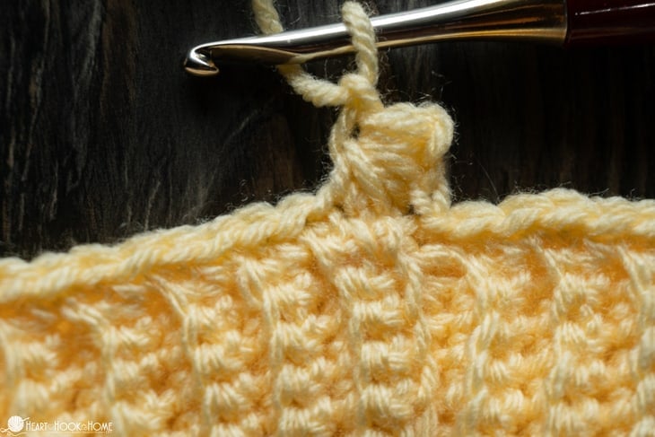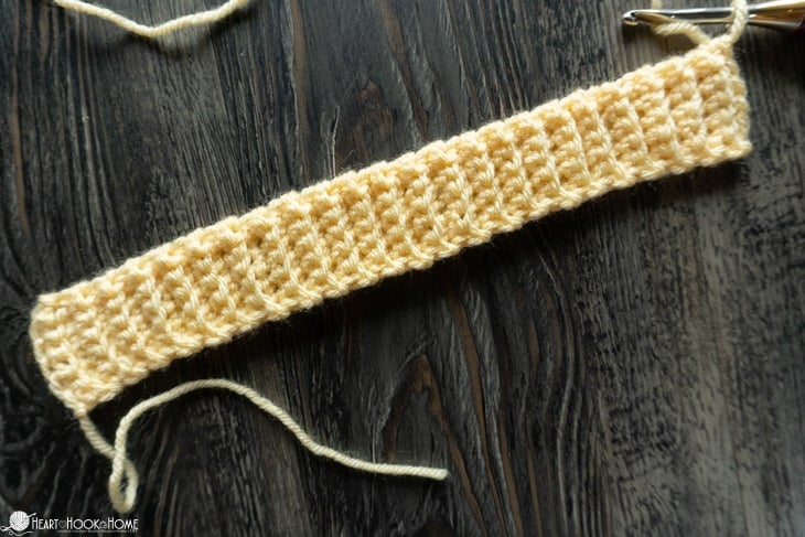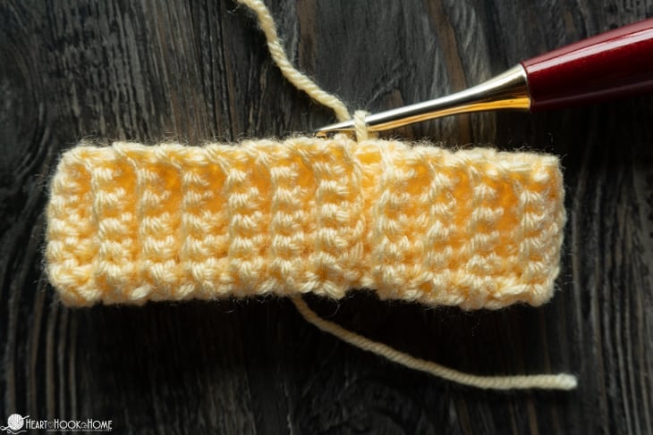 Rows 2 – (46, 52, 70): Ch-1, turn, sc in BLO of first (5, 7, 9) sts, sc in both loops of last st. (6, 8, 10)