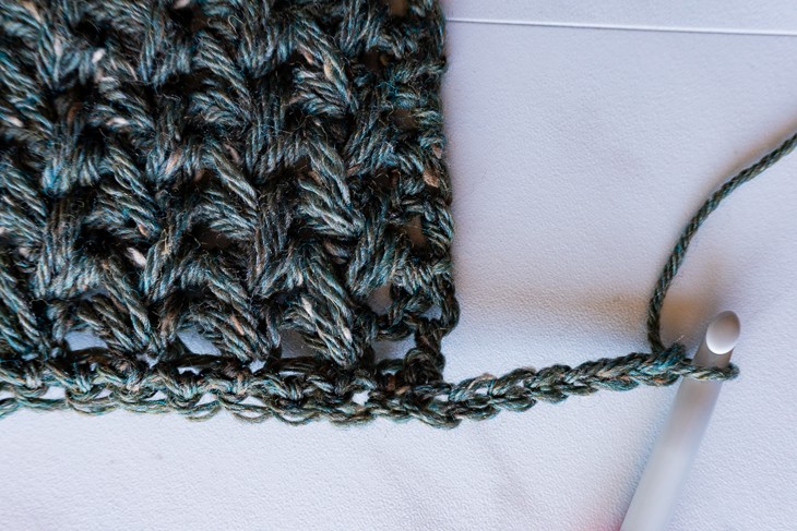 The hood is optional, but adds so much warmth. If adding the hood, do so before starting the edging. Attach yarn in top right corner, looking at outside of cape.