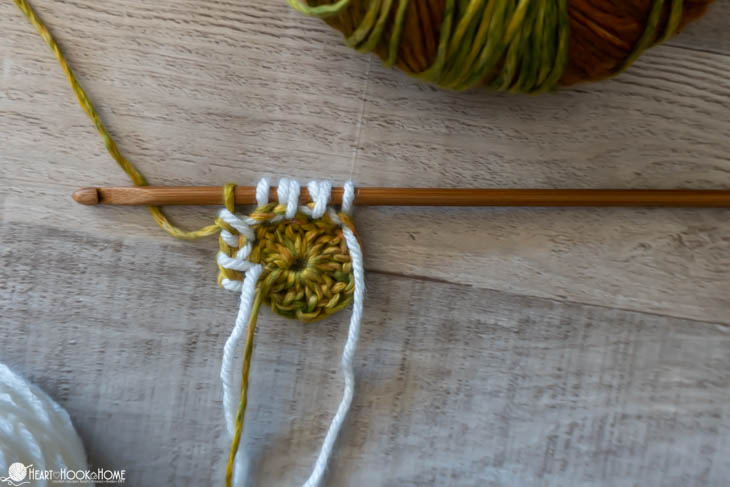 What type of yarn works best for Tunisian Granny Squares? You can use any yarn you like. To make the colors really pop you’ll want to use two contrasting colors of yarn. For this tutorial I am using a white Brava Worsted 500 skein with some fancy color-changing yarn I picked up on vacation this summer.