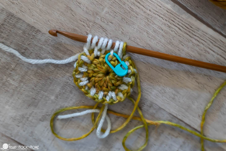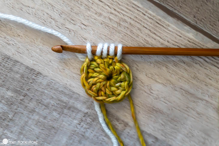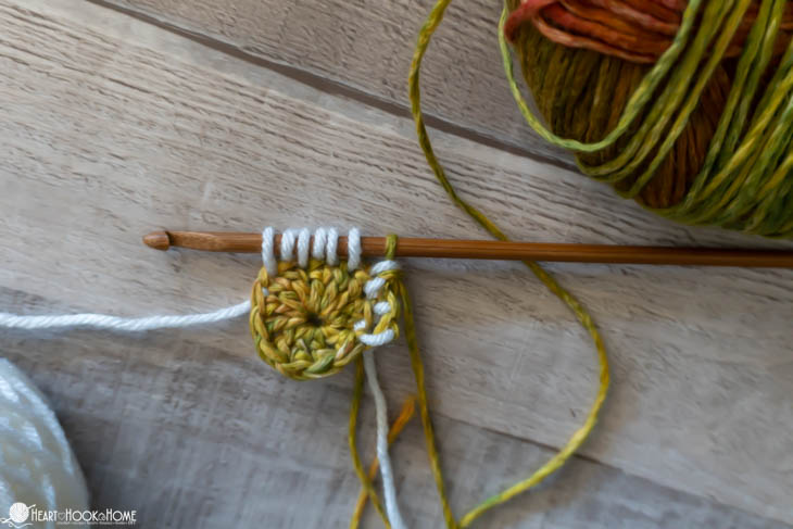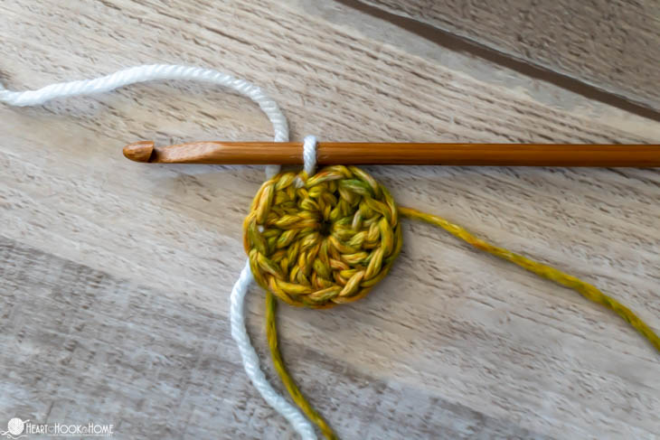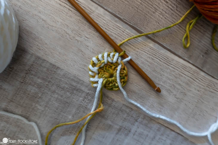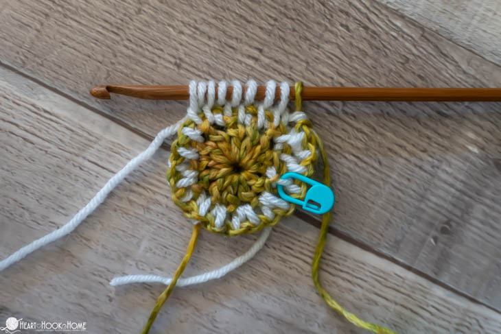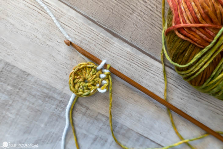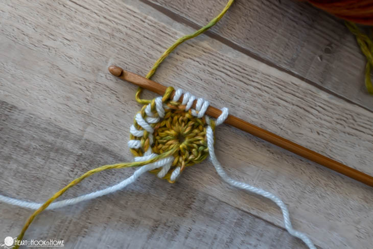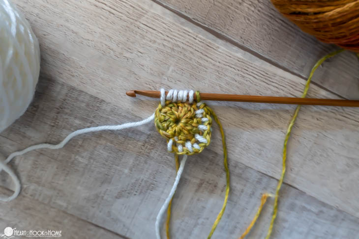 To start, make a magic circle using Color B. Chain one and make 12 double crochets in the circle. Pull tight. Join to the top of the first stitch made using Color A.