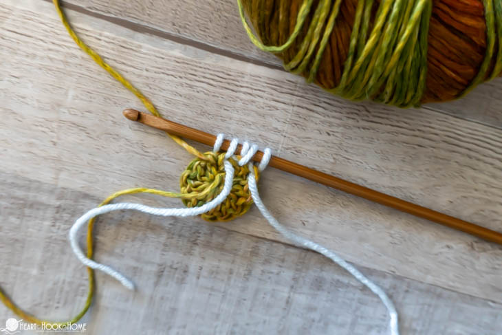 To get these gorgeous color changing effects you’ll want to use a solid color yarn for Color A (the Forward Pass, white in this tutorial) and a contrasting yarn color for Color B (the Backward Pass).
