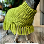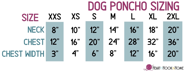 This poncho pattern for dogs spans several sizes, from XXS to 2XL. When selecting which size to make for your dog, you’ll want to measure their neck first. Make the size that will comfortably fit without being tight. The length of the chest and the length of the body are completely customizable for each individual dog. LOVE THAT!