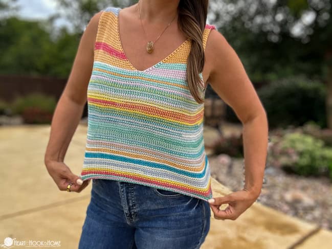 I hope you love this super simple, super CUTE Tunisian Crochet Tank.ย Be sure to tag @HeartHookHome across all social media, or share in the Heart Hook Home Crochet Community on Facebook.