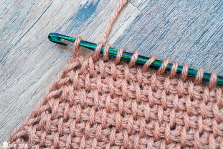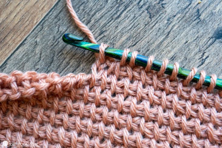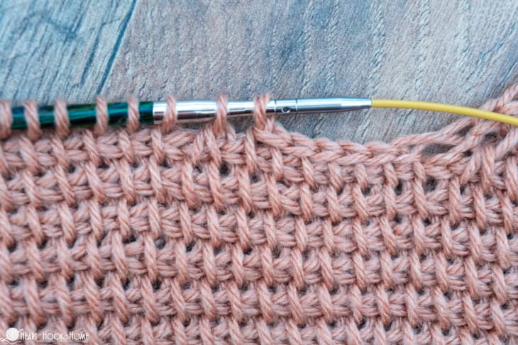 TSS2tog: Tunisian Simple Stitch two together – insert hook under next two vertical bars and pull up one loop.