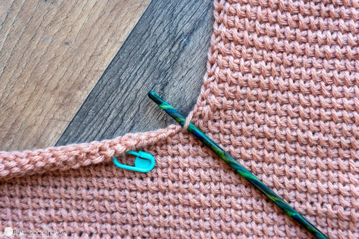 Find the stitch (3) rows up from the armhole row. Attach with sl st.