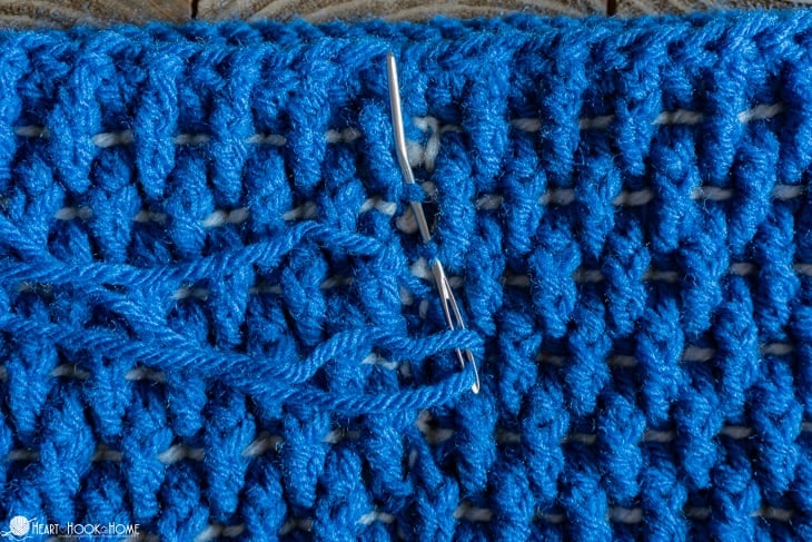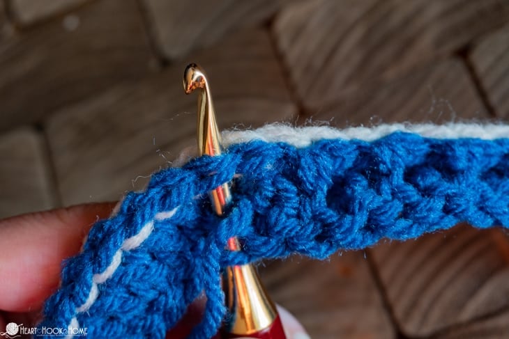 Use Color A for the double crochet/post stitch rows and Color B for the slip stitch rows. Carry the opposite yarn at each rowโs join.